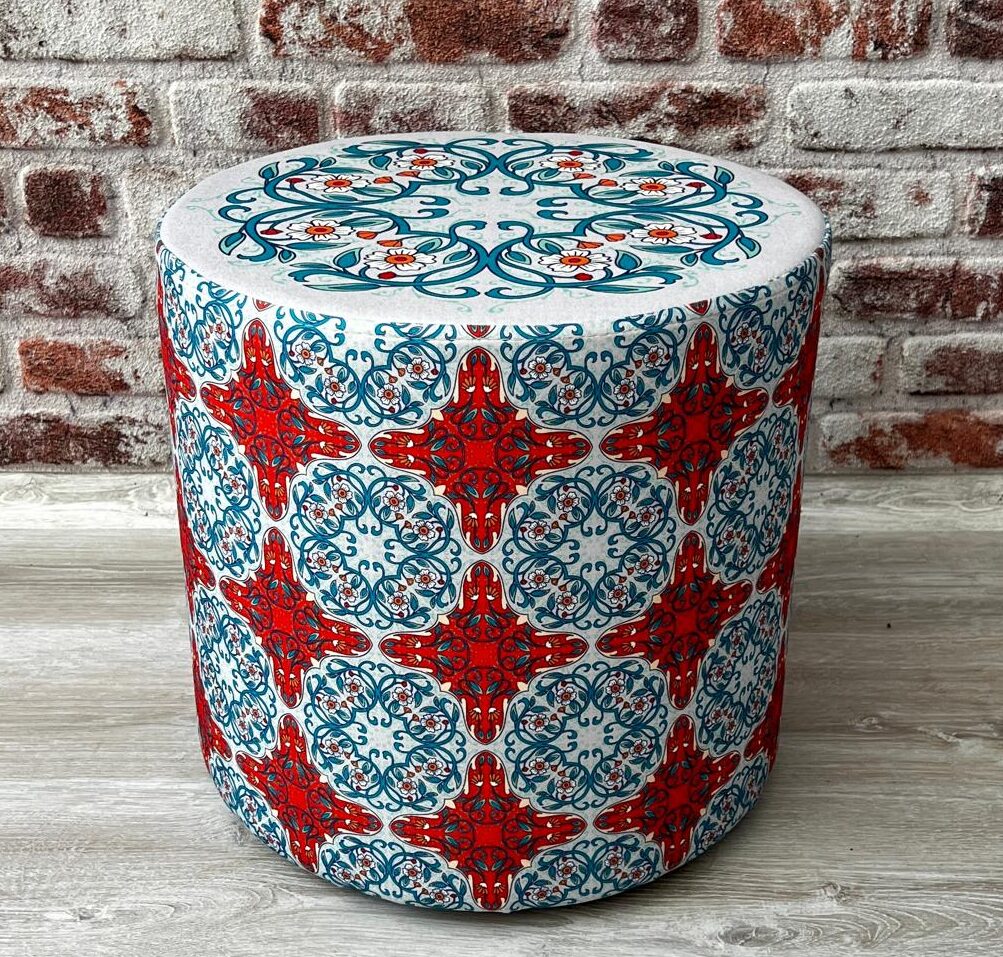 - Raşel döşemelik kumaş ile kaplanmış bu yuvarlak puf, Papatya desenlerinin zarif detayları ve bohem tarzının rahatlığıyla mükemmel bir uyum içinde.