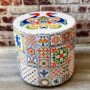 - Raşel döşemelik kumaş ile kaplanmış bu yuvarlak puf, Sicilya desenlerinin zarif detayları ve bohem tarzının rahatlığıyla mükemmel bir uyum içinde.
